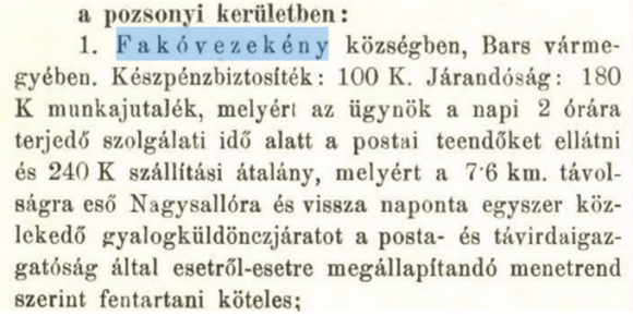 V okrese Bratislava: 1. V obci Fakóvezekeny, v okrese Bars. Hotovostná záloha: 100 K. Odmena: 180 K pracovná provízia, za ktorú je povinný vybavovať maklér počas 2 hodín služby denne a 240 K paušál za dopravu, ktorá predstavuje je 7,6 km. je povinný udržiavať pešiu kuriérsku službu, ktorá premáva raz denne do Nagysallo, ktorá je vzdialená, a späť podľa harmonogramu, ktorý v jednotlivých prípadoch stanoví Riaditeľstvo pôšt a telekomunikácií.